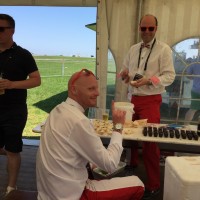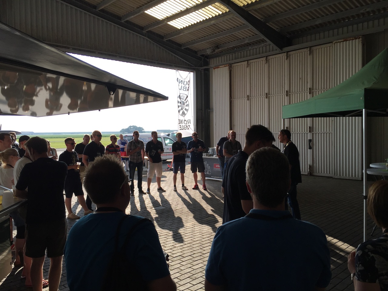 So langsam trudelten auch schon unsere ersten Gäste aus Dänemark ein, spätestens hier war allen Euro-Meeting-Neulingen klar, dass das ein ganz tolles Wochenende gemeinsam mit unseren europäischen Freunden werden sollte. Auch wenn bei dem ein oder anderen etwas Schüchternheit zu verzeichnen war, schienen sich unsere Gäste wohl zu fühlen. Das lag natürlich auch an der guten Verpflegung; wir haben uns für diesen Abend nicht weniger als einen eigenen Fleischer- und Grillmeister besorgt, der viele Spezialitäten aus eigener Herstellung vorbereitete. Nach gut einer Stunde hat unser Präsident Thomas die mittlerweile vollständige Euro-Truppe offiziell begrüßt. Der tobende Applaus galt nicht nur der herzlichen Ansage, sondern auch dem tollen Setting des Abends: großer Flugzeughangar, Flugbetrieb, senkende Sonne hinterm Deich, treibende House-Klänge und rings herum grüne Wiesen. Die Stimmung war sofort freundschaftlich und voller Erwartungen für das Wochenende.