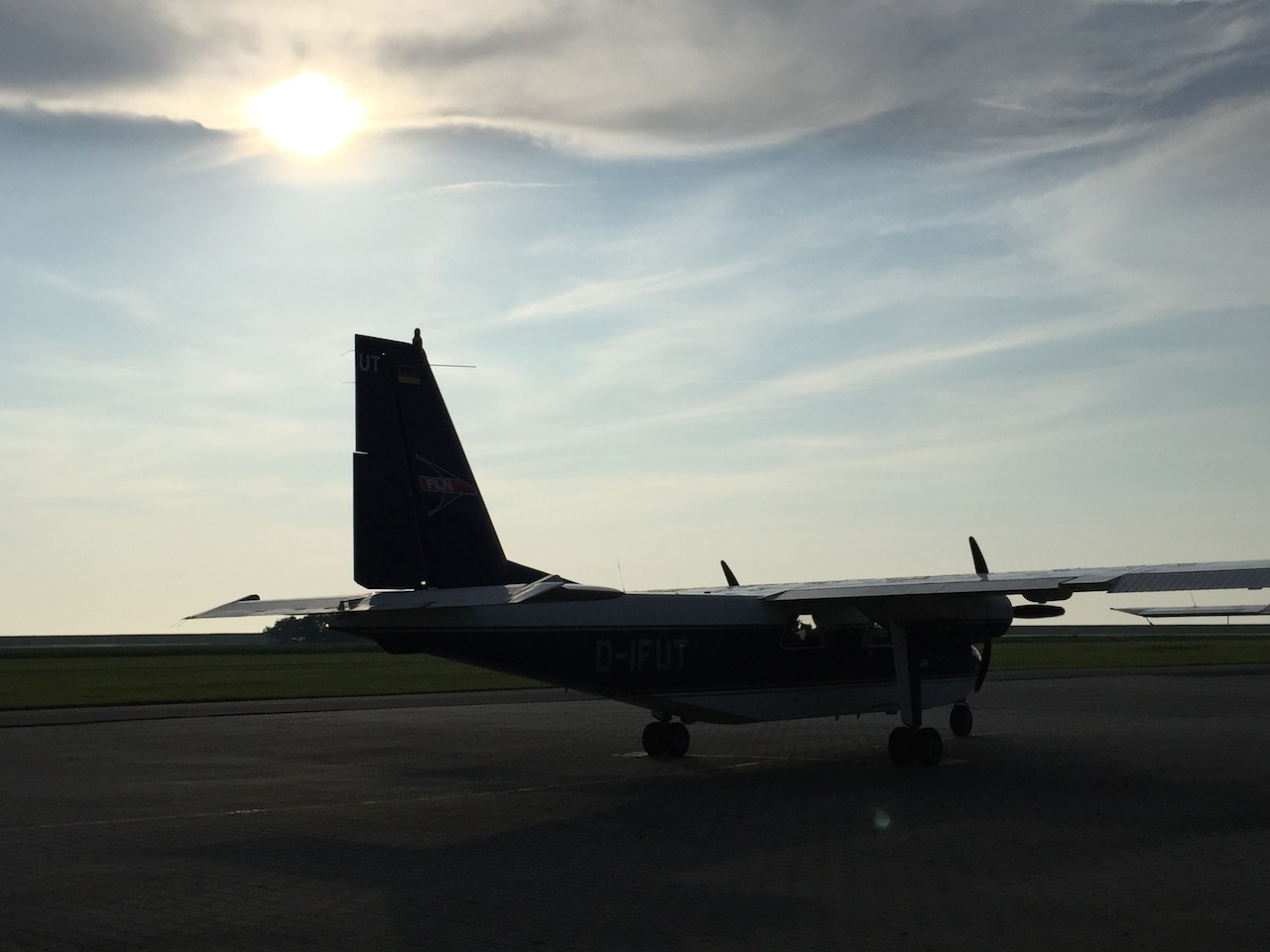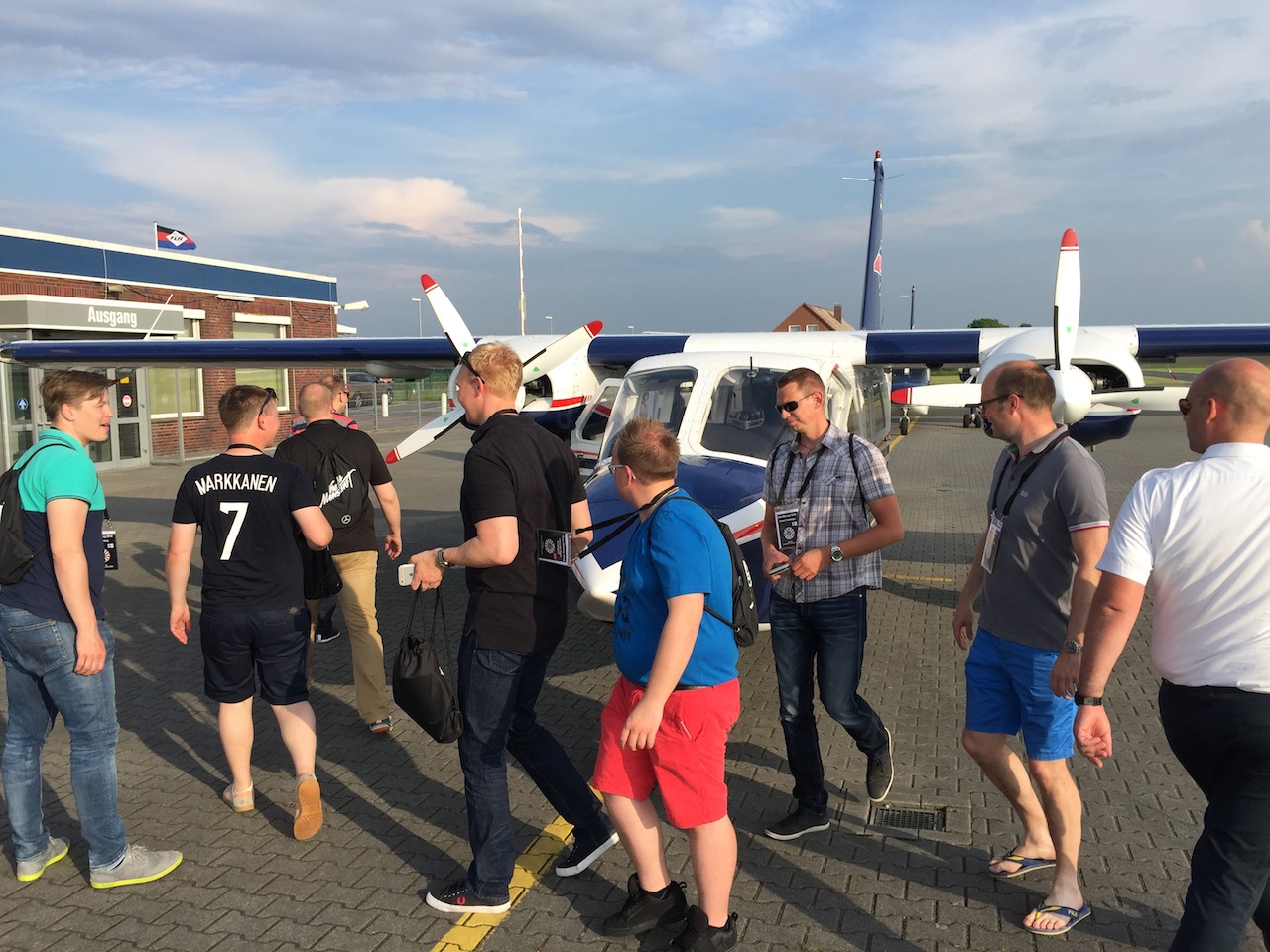 Angekommen am Norddeicher Flughafen gab es sofort die ersten Aufgaben zu erledigen: Aufbau des Welcome-Desks, der Musikanlage, der Sitzbänke, des Getränkewagens und und und…Da aber alle fleissig angepackt haben, war auch dieser Aufbau ein Kinderspiel für uns. Und das alles im Schatten dieser großen Propellermaschine, die trügerisch vor dem Hangar stand. Sollte dieser Inselhüpfer heute noch in Aktion treten?