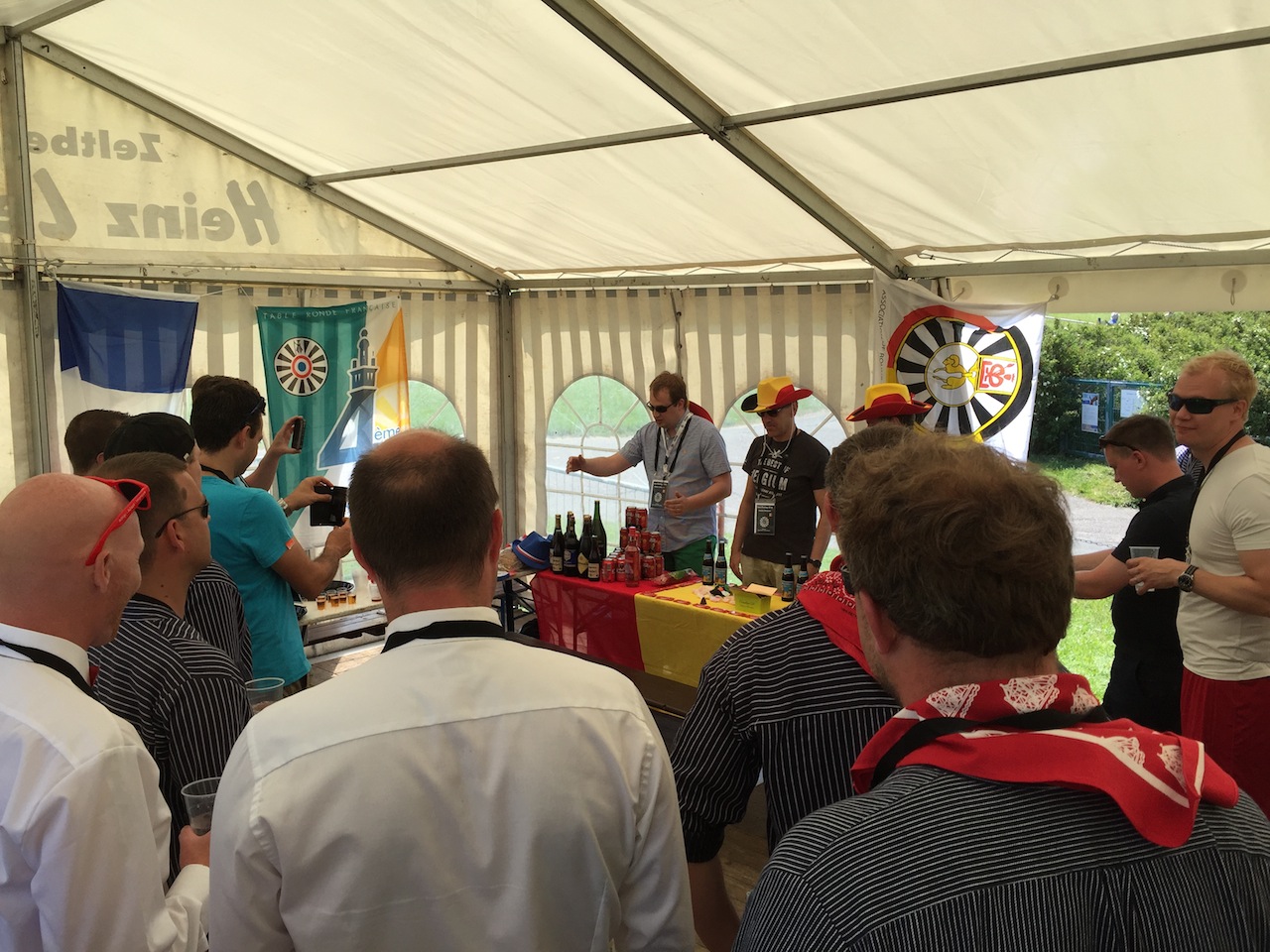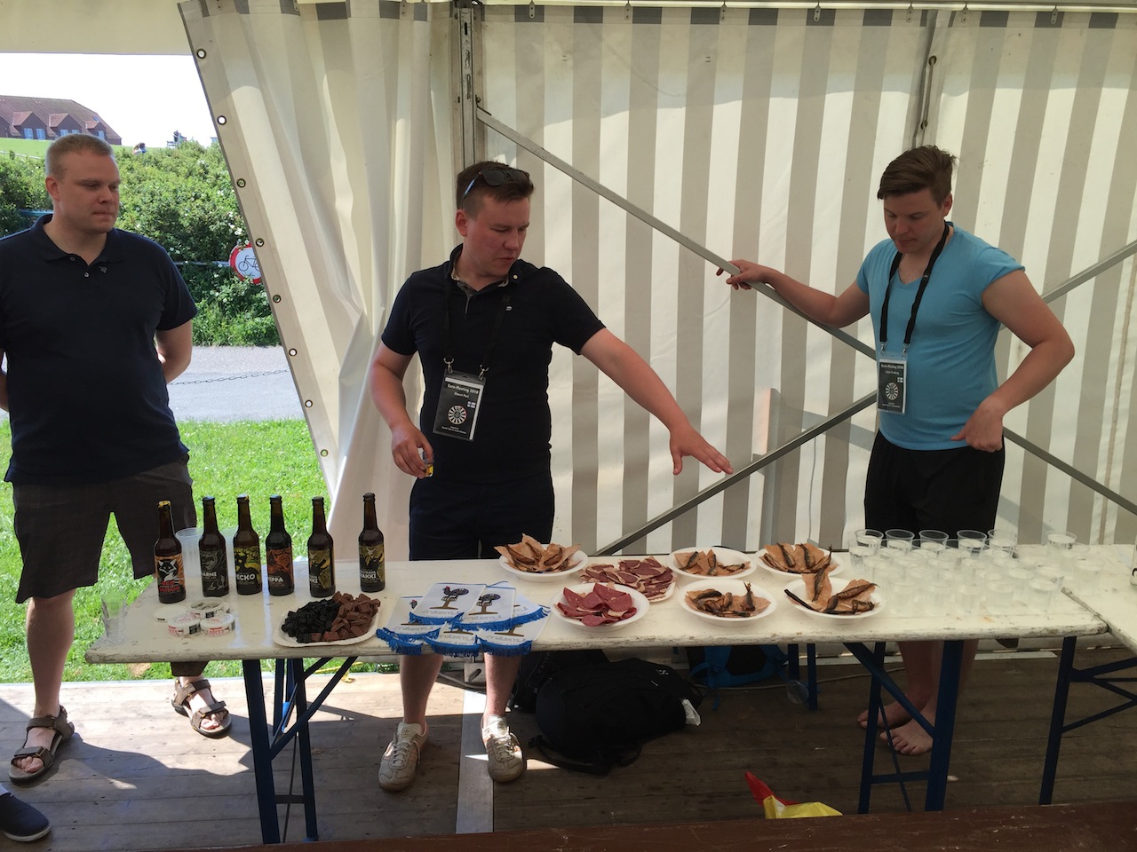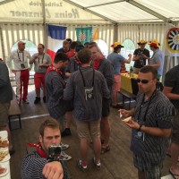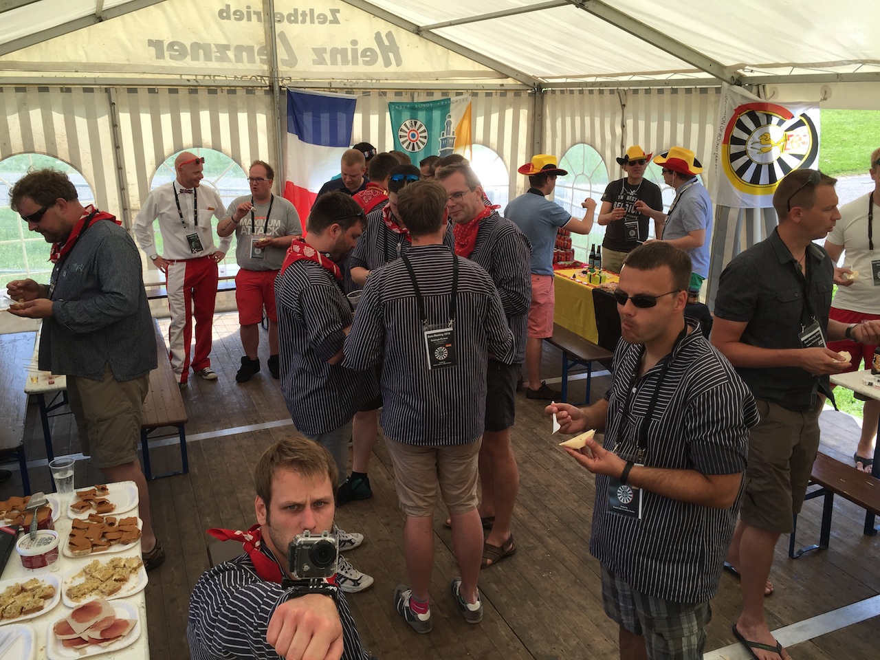 Letztlich haben es dann doch alle in unser eigens dafür errichtetes Zelt direkt am Haus des Gastes geschafft. Der ein oder anderen sollte zunächst den Nachdurst stillen, aber mit fortschreitender Stunde konnte dann der offizielle Teil des Euro-Meetings eröffnet werden. Denn bevor der neue Euro-Präsident gewählt wird, darf jedes Land erstmal kulinarische Spezialitäten vorstellen, die man als Nicht-Finne oder Nicht-Franzose nie oder selten genießen kann. So hatten die Finnen spezielles Craft-Bier und Elchfleisch im Gepäck, die Norweger Flatbrod mit Schinken, die Dänen einen speziellen Kartoffelsalat und Chili-Schokolade, die Franzosen Käse und Cognac und schließlich die Belgier Bier und Süßigkeiten. Wir haben das urdeutscheste gekocht: Sauerkraut mit Kasseler. Lustige Outfits haben das Ganze noch abgerundet, daher auch unsere stylischen Fischerhemden. Schließlich kam es zur Abstimmung zur Präsidentenwahl, die dann der Norweger Aleksander gewonnen hat. Und da uns die Belgier eigentlich nächstes Jahr zum Euro-Meeting einladen wollten, ein hierfür passendes Festival als Rahmenprogramm jedoch ein Jahr aussetzt, hat Norwegen kurzerhand die Austragung übernommen. Respekt!