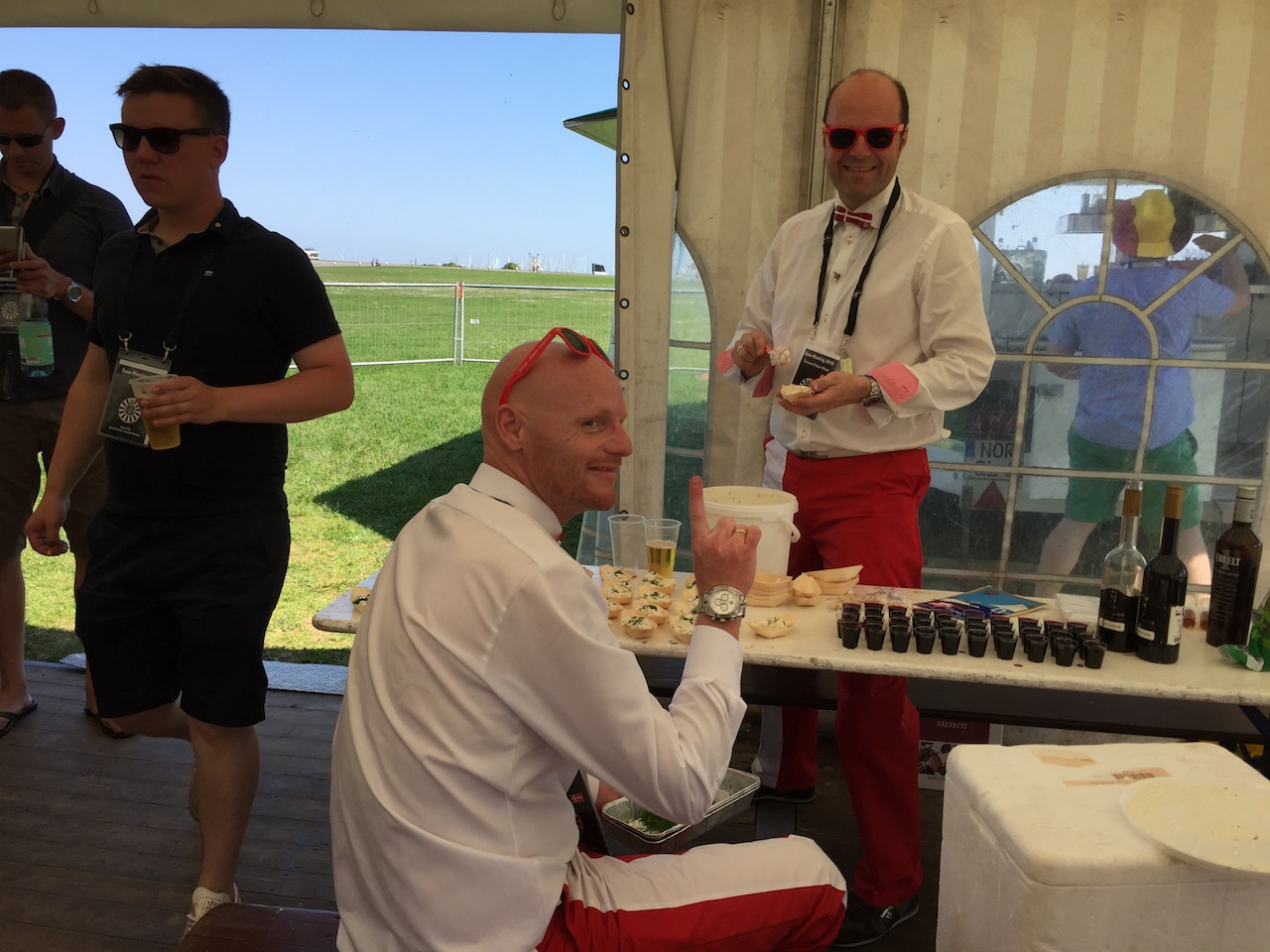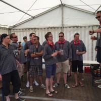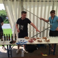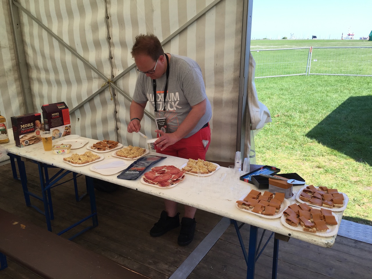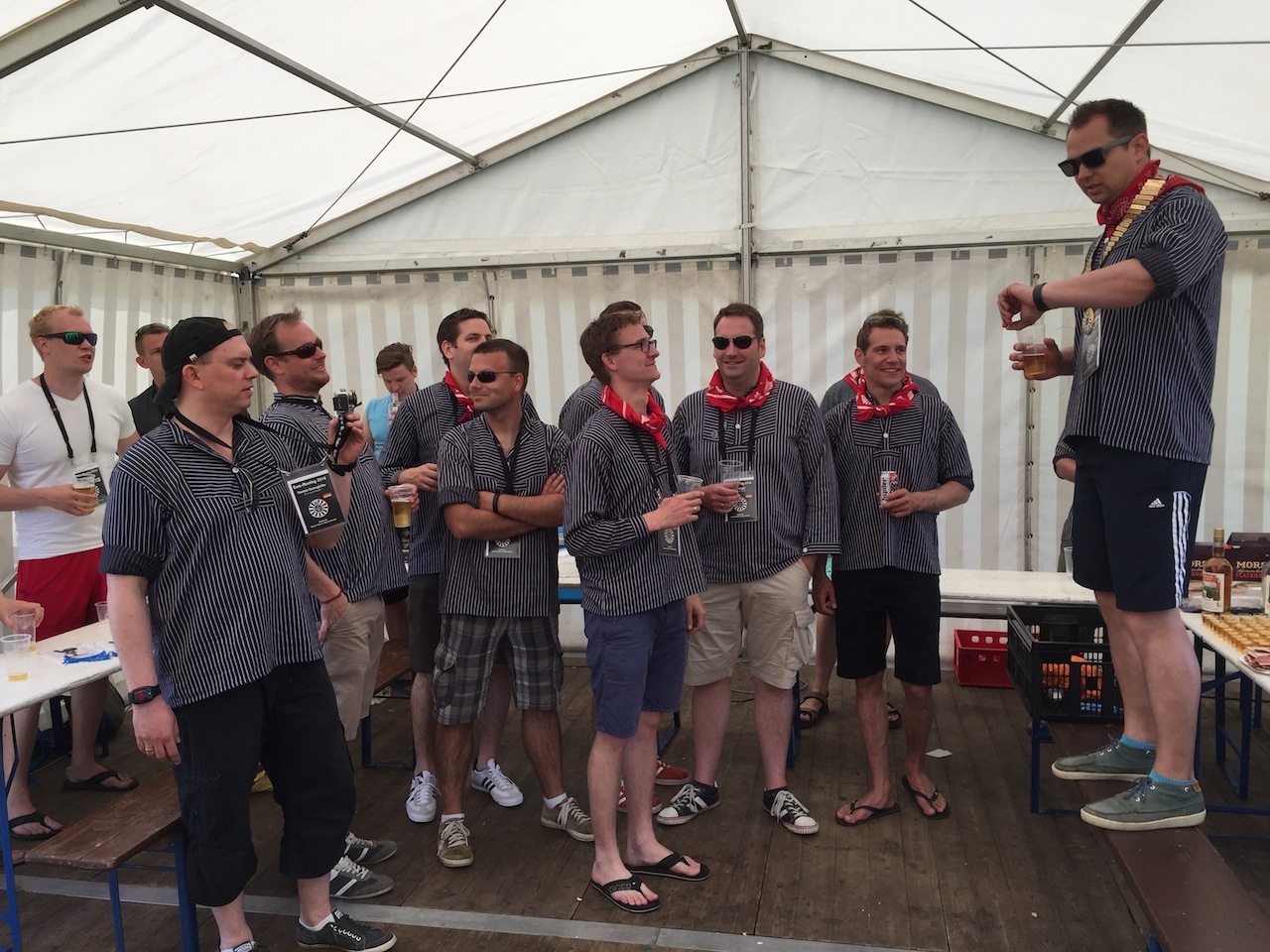 Letztlich haben es dann doch alle in unser eigens dafür errichtetes Zelt direkt am Haus des Gastes geschafft. Der ein oder anderen sollte zunächst den Nachdurst stillen, aber mit fortschreitender Stunde konnte dann der offizielle Teil des Euro-Meetings eröffnet werden. Denn bevor der neue Euro-Präsident gewählt wird, darf jedes Land erstmal kulinarische Spezialitäten vorstellen, die man als Nicht-Finne oder Nicht-Franzose nie oder selten genießen kann. So hatten die Finnen spezielles Craft-Bier und Elchfleisch im Gepäck, die Norweger Flatbrod mit Schinken, die Dänen einen speziellen Kartoffelsalat und Chili-Schokolade, die Franzosen Käse und Cognac und schließlich die Belgier Bier und Süßigkeiten. Wir haben das urdeutscheste gekocht: Sauerkraut mit Kasseler. Lustige Outfits haben das Ganze noch abgerundet, daher auch unsere stylischen Fischerhemden. Schließlich kam es zur Abstimmung zur Präsidentenwahl, die dann der Norweger Aleksander gewonnen hat. Und da uns die Belgier eigentlich nächstes Jahr zum Euro-Meeting einladen wollten, ein hierfür passendes Festival als Rahmenprogramm jedoch ein Jahr aussetzt, hat Norwegen kurzerhand die Austragung übernommen. Respekt!