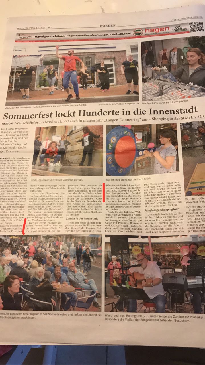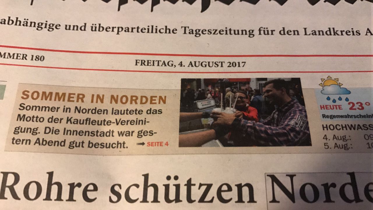 Hier noch ein Paar Bilder und Zeitungsausschnitte vom Sommerfest Norden Anfang August, auf dem wir auch wieder mit einem Caipirinha-Stand vertreten waren. Da ich selbst nicht anwesend war, lasse ich die Bilder sprechen ;-).