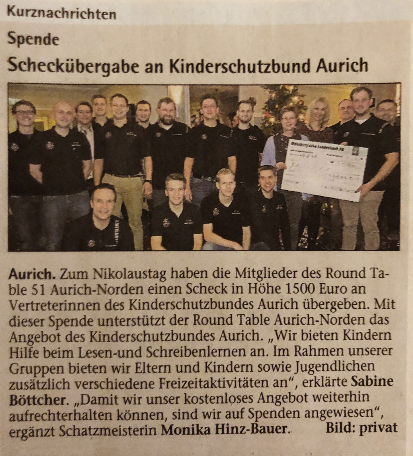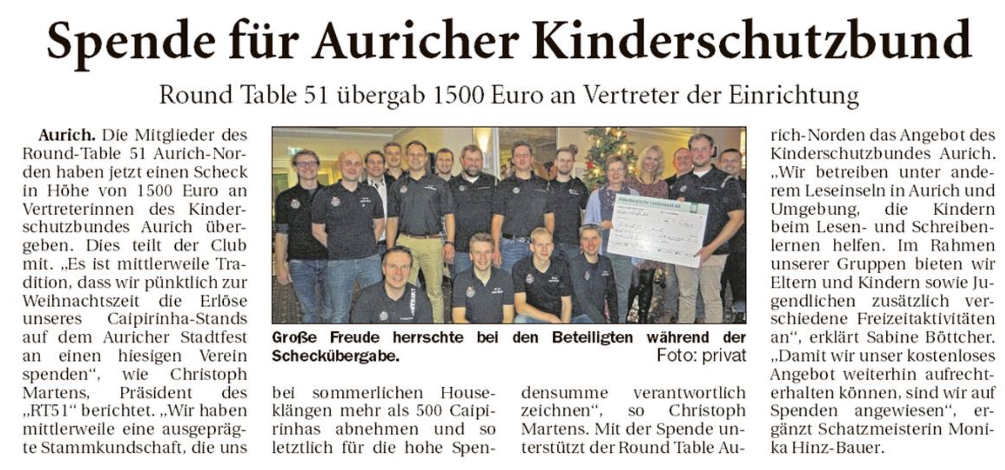 Presseartikel: 1.500 € Spende an den Kinderschutzbund