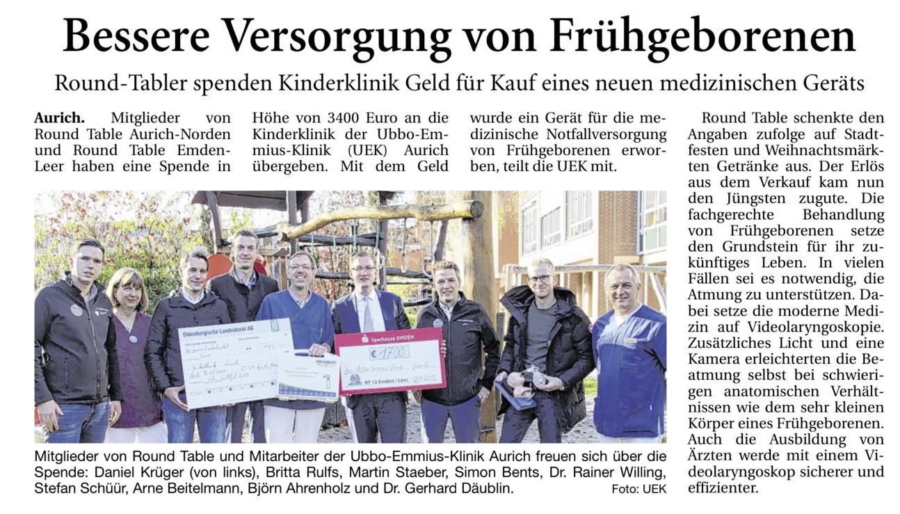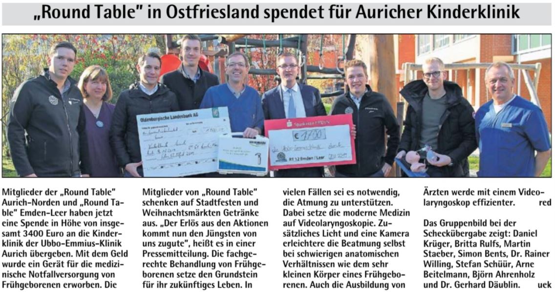 Eine Besonderheit sei hier hervorgehoben: diese Spende haben wir gemeinsam mit unseren Freunden vom Round Table 12 Emden/Leer generiert, wennngleich die Spendengelder auf getrennten Veranstaltungen gesammelt wurden. Dennoch zeigt sich hier wieder einmal der gemeinsame Spirit, ob regional, oder überregional!